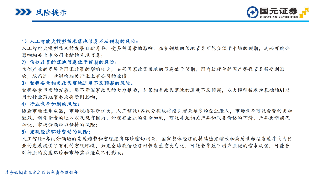 人工智能大模型技术落地节奏不及预期的风险;信创政策的落地节奏低于预期的风险;数据要素相关政策落地进度不及预期