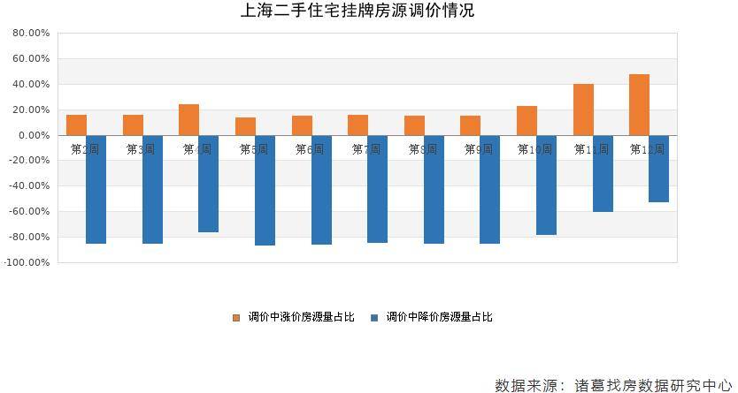 诸葛找房披露的最新一周的数据显示,上海目前挂牌的二手房房源中,其中调价房源有近60%在降价。