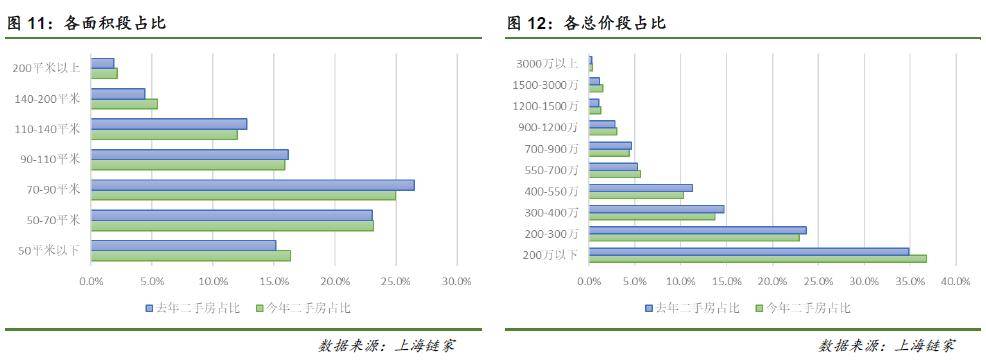 特别是50平以下的占比,增加了2.6个百分点。今年前2月,50平以下和140平以上的成交占比增加,分别占比16.4%和7.6%,较去年同期各增加了1.3个百分点。