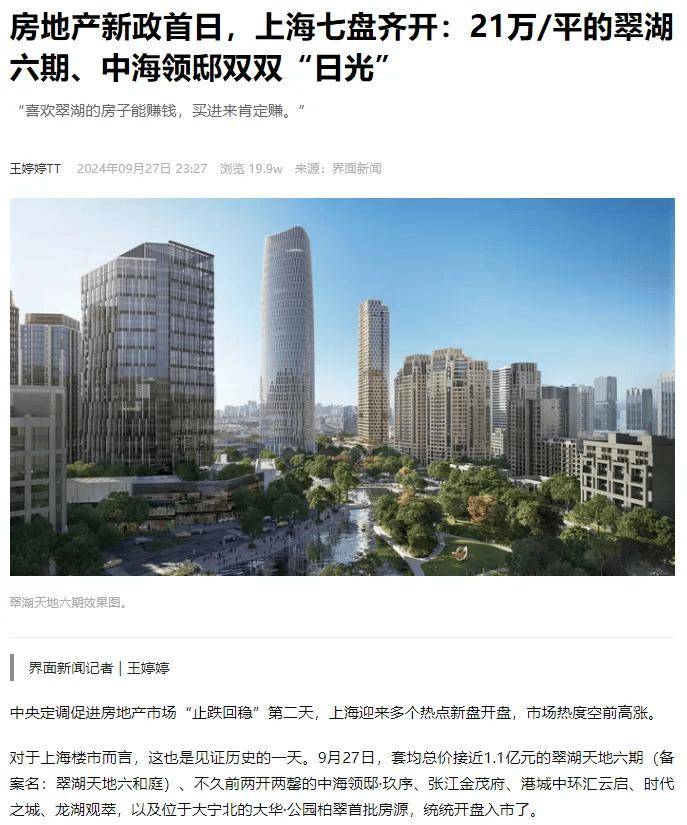 去年上半年,位于上海黄浦区核心地段的 中海·顺昌玖里,一天卖出了512套房源中的505套,总销售额达196.53亿元,这个销售数字被创造了全国商品房有史以来单次开盘最高销售额纪录。