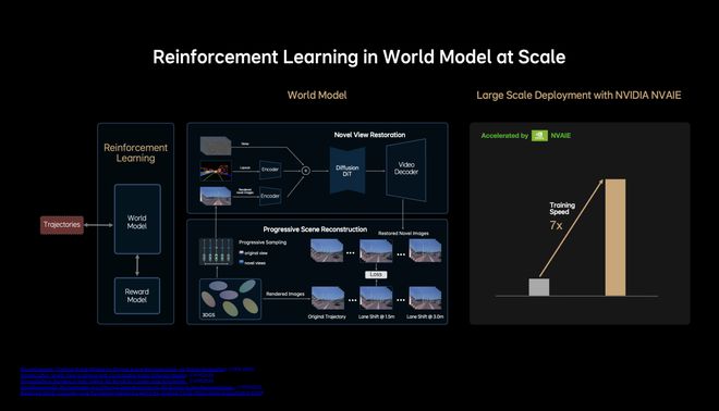 MindVLA基于自研的重建+生成云端统一世界模型,深度融合重建模型的三维场景还原能力与生成模型的新视角补全,以及未见视角预测能力,构建接近真实世界的仿真环境。源于世界模型的技术积累与充足计算资源的支撑,MindVLA实现了基于仿真环境的大规模闭环强化学习,即真正意义上的从“错误中学习”。过去一年,理想自动驾驶团队完成了世界模型大量的工程优化,显著提升了场景重建与生成的质量和效率,其中一项工作是将3D GS的训练速度提升至7倍以上。