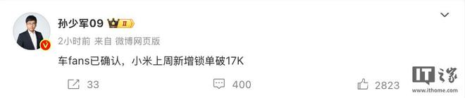 IT之家 3 月 24 日消息,博主“孙少军 09”发文,透露小米汽车上周(2025 年 3 月 17 日至 3 月 23 日)新增锁单超 1.7 万台。作为比较,IT之家注意到今年2月小米汽车交付量约2万台。