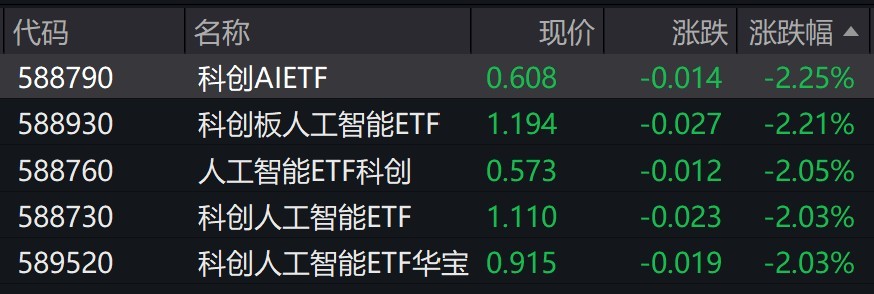 受重仓股调整影响,跟踪上证科创板人工智能指数的ETF跌逾2%。
