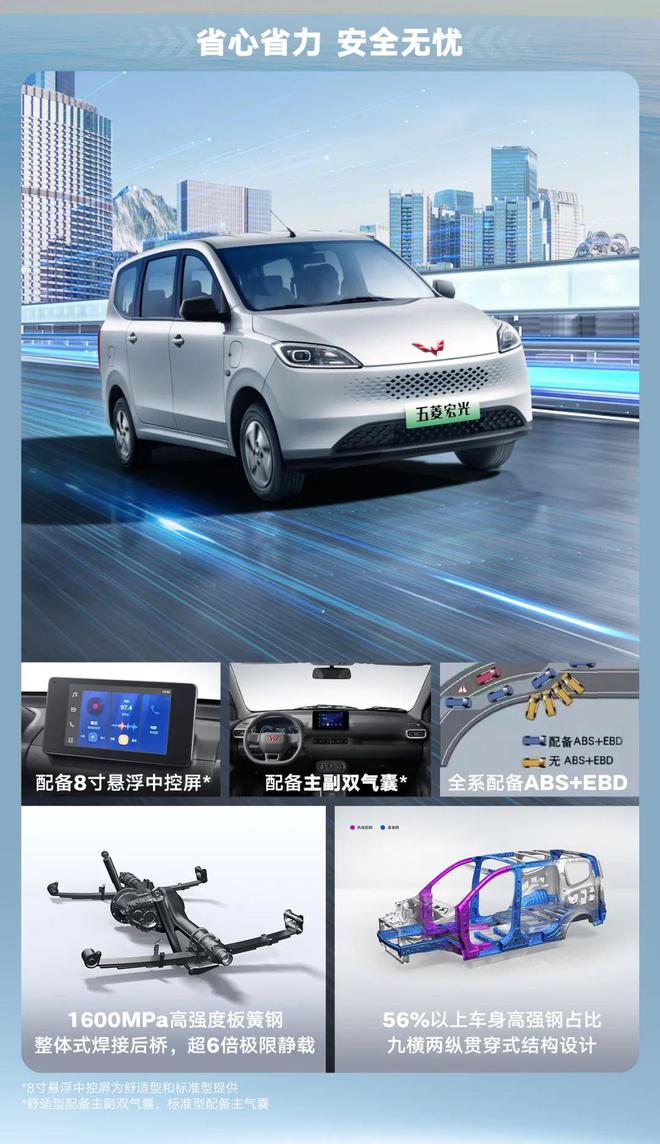 该车全系自动挡,标配EPS 电动助力系统。在安全性方面,五菱宏光增程版配备 ABS防抱死、EBD电子制动力分配系统,以及 LED 大灯等主动安全配置;同时配备主副双气囊,以及 8 寸悬浮中控屏,还配备后座空调。