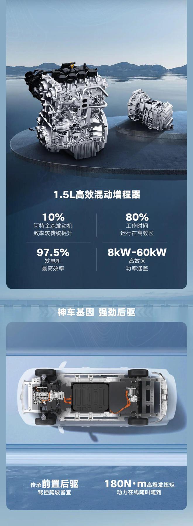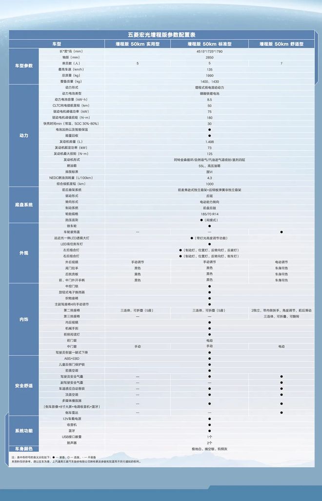 五菱宏光增程版汽车尺寸为 4515x1725x1790mm,轴距 2850mm;配有 8.5 度磷酸铁锂电池,CLTC 纯电续航 50km;电机峰值功率 75kW,支持快充;配有 1.5L 增程器和 55L 高压油箱,NEDC 百公里油耗 4.3L,综合续航超 1000km。IT之家附配置表如下:
