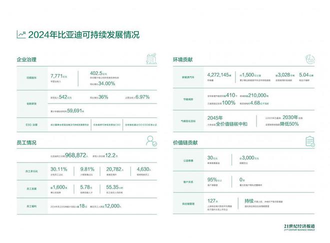 3月26日,比亚迪发布2024年可持续发展报告,系统性披露了公司在环境、社会及治理(ESG)领域的战略规划、实践成果与长期承诺。报告显示,比亚迪以技术创新为核心,深度践行可持续发展理念,在绿色低碳发展、社会责任履行及企业治理优化等方面取得显著成效。