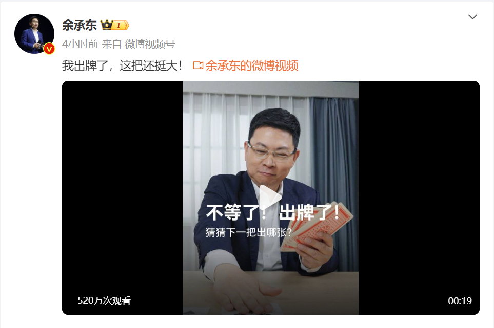 3月5日,华为常务董事余承东在预热视频中表示:“我出牌了,这把还挺大。2025款问界M9本月即将上市,问界M8将于4月上市,两者组成问界的‘王牌’组合。”