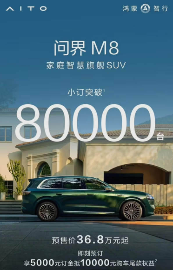 3月27日,鸿蒙智行宣布其问界M8车型预订量已超过8万台。据了解,问界M8于3月6日开启预订,预售价36.8万元起,将于4月中旬上市。
