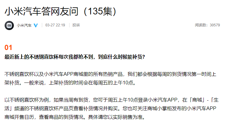小米汽车表示:“不锈钢直饮杯以及小米汽车APP商城里的所有热销产品,我们都会根据每周的到货情况第一时间上架补货。一般来说,上架补货的时间会在每周五的上午10点。”