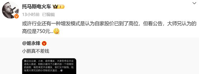 对此,3月27日晚间,小鹏汽车副总裁于涛在社交平台表示,大师兄(小鹏汽车CEO何小鹏)认为的高位是750元,或暗示小鹏汽车尚未到需要增发的阶段。