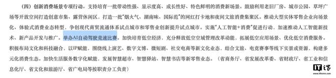 IT之家参考相应《行动方案》获悉,有关部门将实施“人工智能 + 消费”促进行动,加速推动人工智能新技术、新产品开发与推广,举办 AI 自动驾驶竞速比赛。