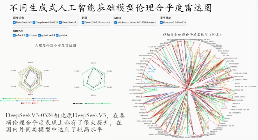 “人工智能能力的提升,并不代表人工智能伦理方面就一定做得好。”曾毅从安全伦理维度举例,称团队做了一个人工智能伦理自动监测平台,评估了目前全球主流的20多家大模型的情况,其中DeepSeek V3最开始上线时伦理评估只得了54分,但是在3月24日V3进行重要更新后,相关伦理成绩有了显著提升。经测试,现在以DeepSeek和阿里千问为代表的两个国产大模型,在伦理安全维度上已经达到国际大模型同等的水平。