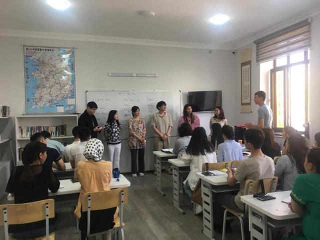 在撒马尔罕外国语大学,与当地学习韩语的学生交流