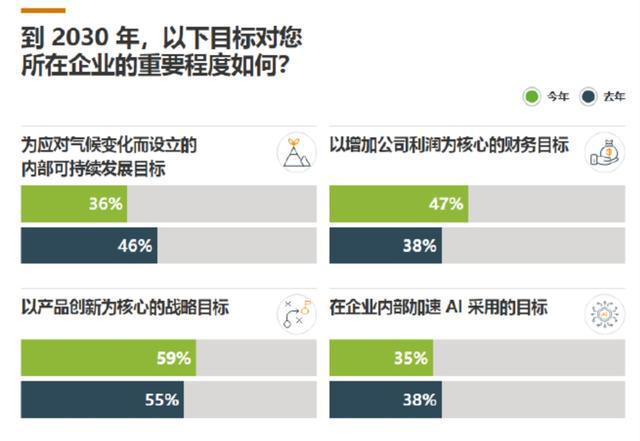 值得一提的是,中国企业对可持续发展的承诺依然坚定。46%的受访者将“2030年实现碳中和”列为最现实的目标,相较于全球数据(38%)更为乐观。与此同时,56%的中国受访者表示,企业加强了可持续指标的追踪和记录;在全球受访者中,这一比例为49%。