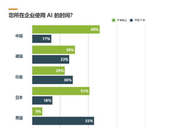 调研还发现,不同国家的AI采用率存在差异。在受访国家中,中国企业AI采用率更高,时间更长。60%的中国受访者表示其企业已经使用AI超过三年,高于全球平均值(中国60% ,全球38%)。