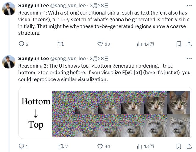 很多网友猜想 GPT-4o 的图像生成采用了「自回归 + 扩散」的范式。比如 CMU 博士生 Sangyun Lee 在该功能发布后不久就发推猜想 GPT-4o 会先生成视觉 token,再由扩散模型将其解码到像素空间。而且他认为,GPT-4o 使用的扩散方法是类似于 Rolling Diffusion 的分组扩散解码器,会以从上到下的顺序进行解码。