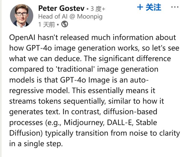 Moonpig 公司 AI 主管 Peter Gostev 认为,GPT-4o 是采用从图像的顶部流 token 开始生成图像的,就像文本生成方式一样。
