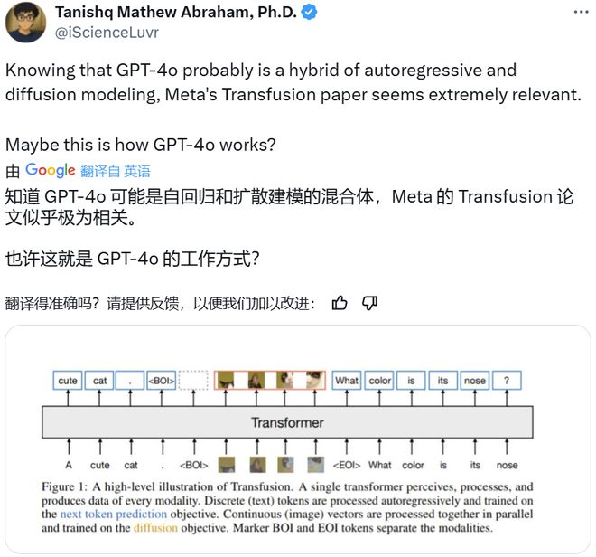 芬兰赫尔辛基的大学副教授 Luigi Acerbi 也指出,GPT-4o 基本就只是使用 Transformer 来预测下一个 token,并且其原生图像生成能力一开始就有,只是一直以来都没有公开发布。