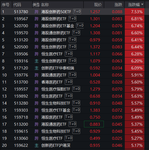 此外,多只港A相关医药ETF集体大涨,尤其是港股创新药ETF表现尤为强势,截至发稿,港股创新药50ETF涨超7.5%。