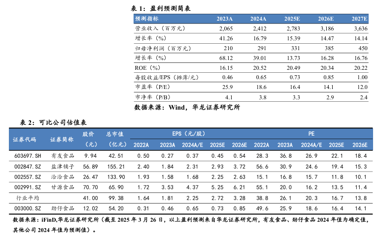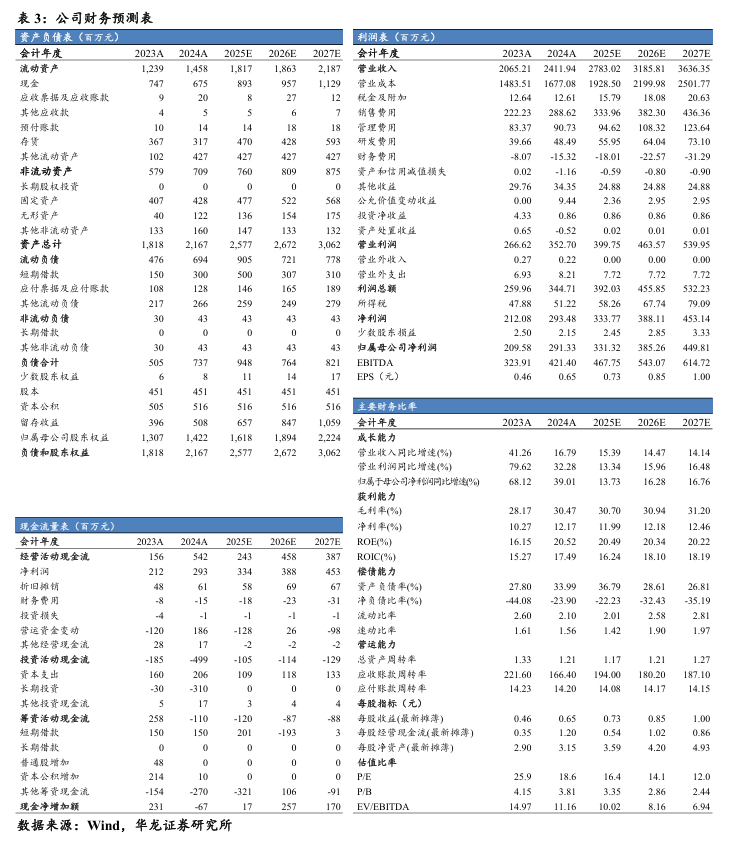 盈利预测及投资评级:根据公司2024年报,我们略下调公司2025-2026年盈利预测,新增2027年盈利预测,我们预计2025-2027年公司实现营业收入27.83亿元/31.86亿元/ 36.36亿元(2025-2026年前值为31.32亿元/38.71亿元),同比增长15.39%/ 14.47%/14.14%;实现归母净利润3.31亿元/3.85亿元/4.50亿元(2025-2026年前值为3.84亿元/4.87亿元),同比增长13.73%/16.28%/16.76%,对应2025年3月26日收盘价,PE分别为16.4X/14.1X/12.0X,参考可比公司的平均估值,我们维持公司“买入”评级。