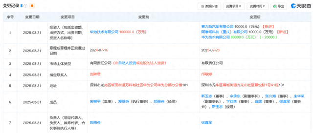 【文/观察者网 潘昱辰 编辑/高莘】天眼查数据显示,3月31日,深圳引望智能技术有限公司发生工商变更,新增赛力斯汽车有限公司、阿维塔科技(重庆)有限公司两家股东,分别持股10%,原股东华为技术有限公司的股权由100%降至80%。
