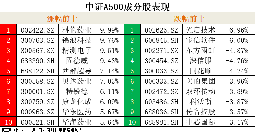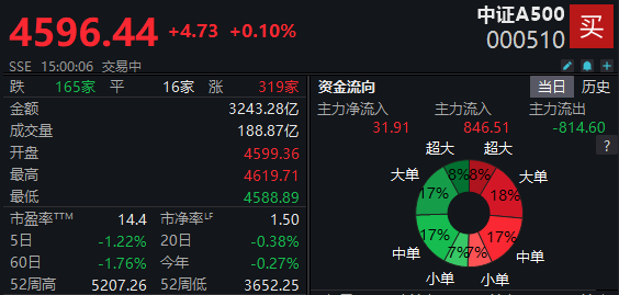 中证A500指数(000510.CSI)今日小幅上涨0.10%,收报4596.44点。成分股中,有319家上涨,科伦药业(002422.SZ)涨停。