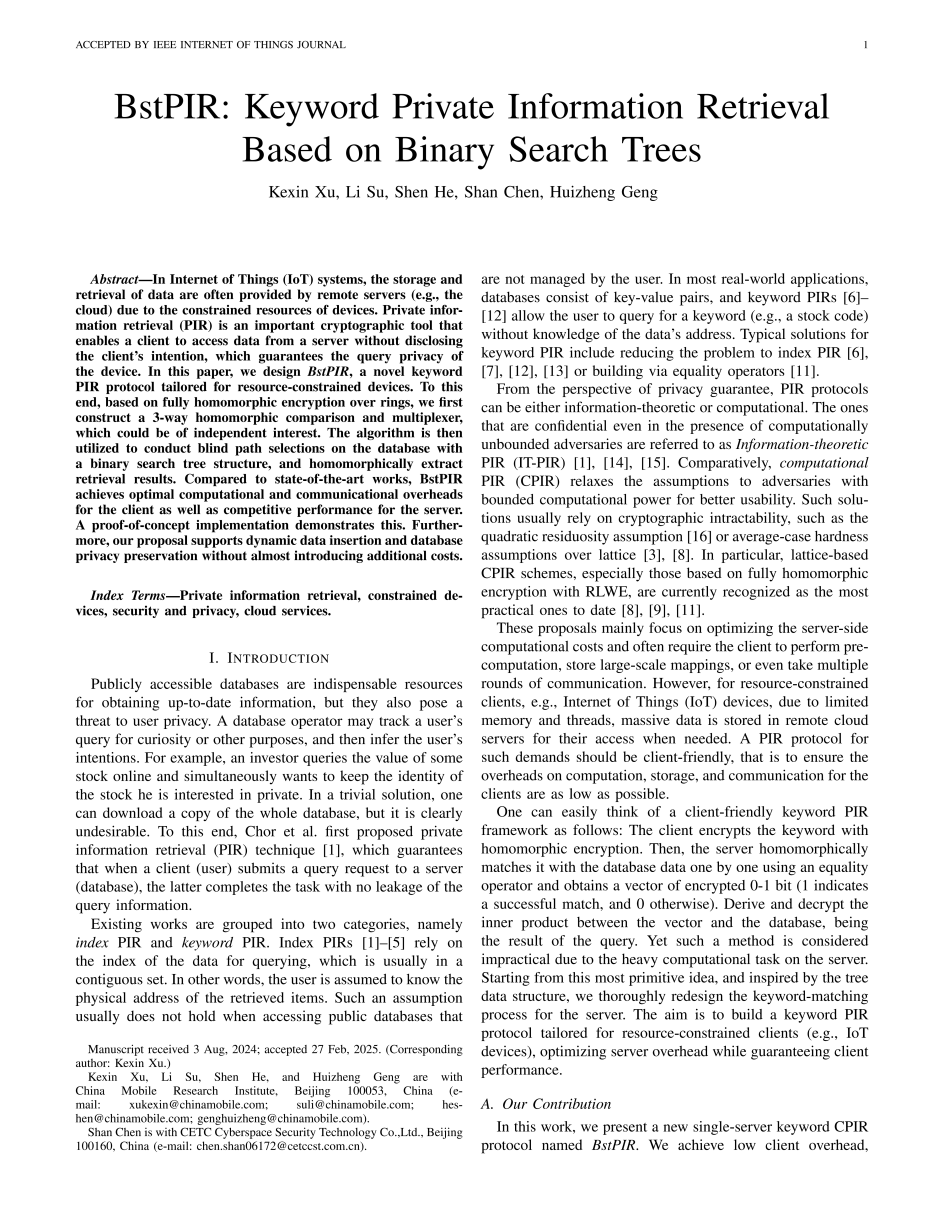 近日,中国移动研究院数据安全学术论文“BstPIR: Keyword Private Information Retrieval Based on Binary Search Trees”被国际顶级期刊《IEEE Internet of Things Journal》录用,期刊最新影响因子为8.2。
