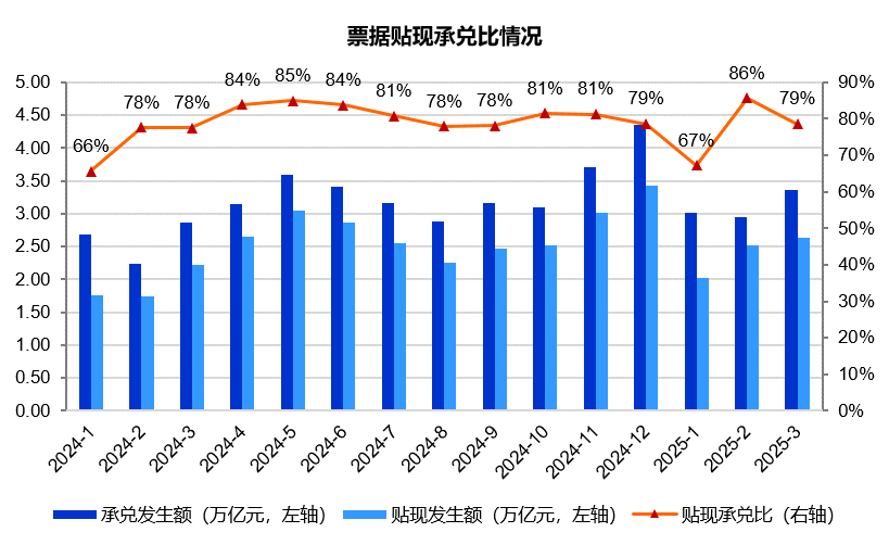 2025年3月,票据市场承兑发生额3.36万亿元,同比增长17%;贴现发生额2.64万亿元,同比增长19%。贴现承兑比为79%,环比出现回落,略高于去年同期,反映票据市场供不应求的状态有所改善,不过依然处于较高水平。