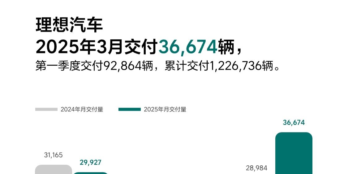 4月1日,理想汽车公布2025年3月交付数据。2025年3月,理想汽车交付新车36,674辆,同比增长26.5%。2025年第一季度共计交付92,864辆,同比增长15.5%。截至2025年3月31日,理想汽车历史累计交付量为1,226,736辆。
