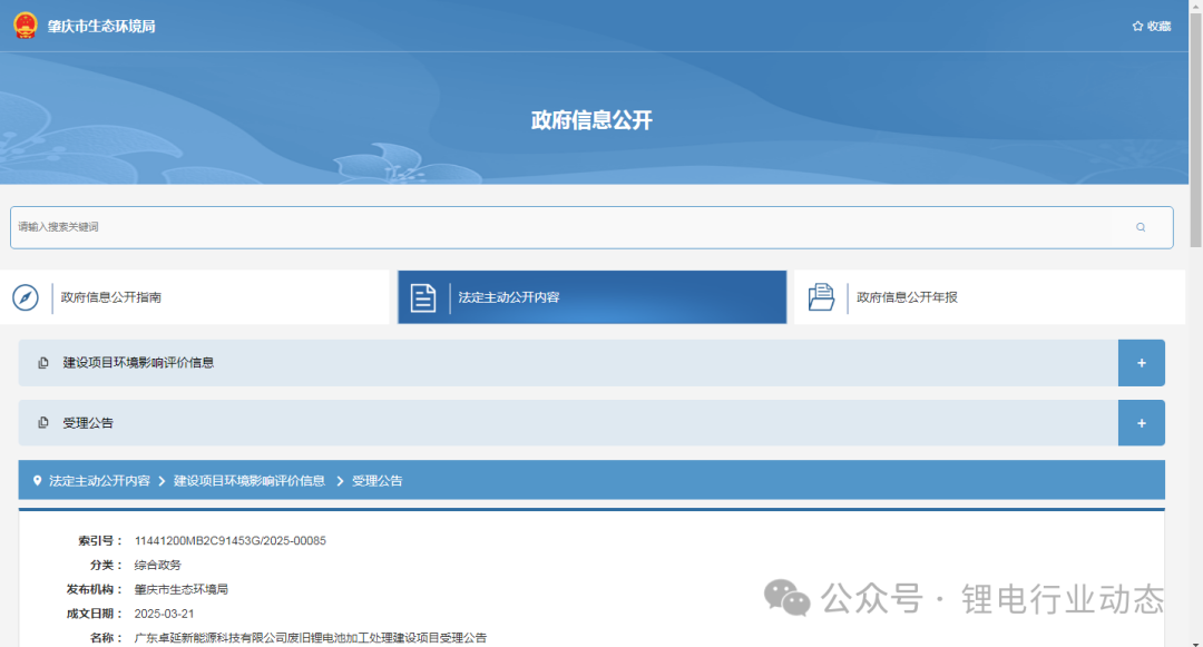 近日,广东省肇庆市生态环境局正式发布了关于《广东卓延新能源科技有限公司废旧锂电池加工处理建设项目》的受理公告,标志着该项目正式进入审批流程。该项目由广东卓延新能源科技有限公司投资9000万元,旨在通过先进的工艺技术对废旧磷酸铁锂电池和废旧三元锂电池进行加工处理,以实现资源的有效回收和再利用。