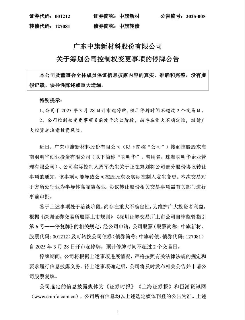 3月27日晚间,中旗新材发布关于筹划公司控制权变更事项的停牌公告,称接到公司控股股东海南羽明华创业投资有限公司(以下简称羽明华,曾用名:珠海羽明华企业管理有限公司)及实际控制人周军关于正在筹划将公司部分股份协议转让事项的通知,该事项可能导致公司控股股东及实际控制人发生变更,交易对手方所处行业为半导体高端装备业。