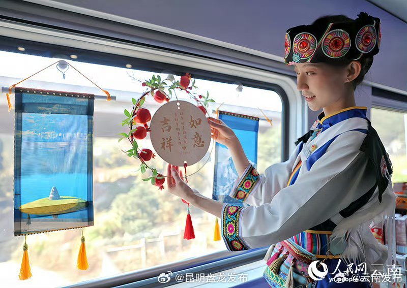 3月31日13时14分,昆明开往香格里拉的C122次“赏花之旅”列车正式开行。该趟赏花列车从四季如春的昆明出发,途经风花雪月的大理,再到浪漫诗意的丽江,最终抵达香格里拉。列车车厢内行李架、头枕片、小桌板等都融入了鲜花元素,列车电视屏幕上展示着鲜花摄影作品和视频,让乘客在乘车过程中,既能感受到鲜花的浪漫,又能感受到浓厚的文化氛围。每个车厢的连接处,有一个鲜花文化墙,一幅幅配以古诗词的云南铁路沿线鲜花美景摄影作品,加上云南鲜花和精致挂件,让春的气息扑面而来。在列车餐吧,一面由10多种鲜花组成的花墙,成为列车打卡点。#有一种叫云南的生活#(摄影:杨紫轩 人民网云南频道 昆明市委宣传部)(@云南发布 )