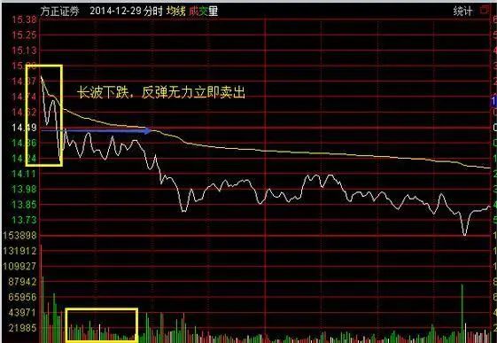 12、当股价沿着均价线下方震荡徘徊的时候应该注意其风险。均价线也可以作为多空的强弱分解线。下方震荡则可称为弱势震荡,很容易破震荡平台创新低。