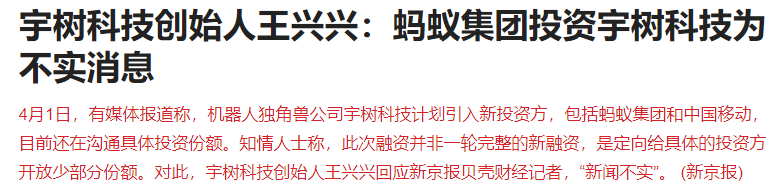 有媒体报道称,机器人独角兽公司宇树科技计划引入新投资方,包括蚂蚁集团和中国移动,目前还在沟通具体投资份额。知情人士称,此次融资并非一轮完整的新融资,是定向给具体的投资方开放少部分份额。对此,宇树科技创始人王兴兴回应新京报贝壳财经记者,“新闻不实”。