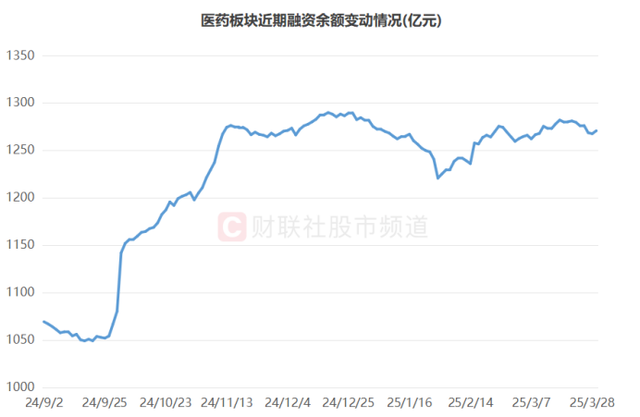 以量能数据统计,医药板块近日再度升温,其中,其今日成交总额达1249.77亿元,不仅为年内最高峰值纪录,同时也创去年11月13日以来近3个半月新高。此外,从资金面来看,截至3月31日数据,其近1个月融资余额变动不大,共获小幅提升近6.4亿元,增幅近0.5%,但从年内行情上看,其较1月下旬低点时已有近50亿元增长,增幅接近4%。