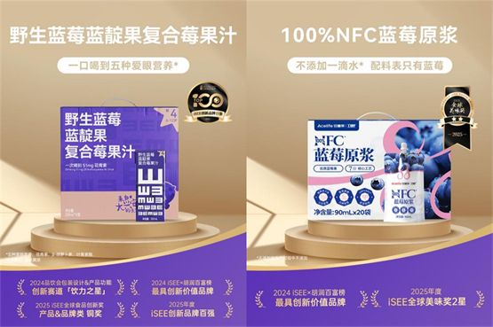 100%蓝莓原浆则凭借“配料表只有蓝莓果”这一强势卖点斩获“iSEE全球美味奖2星”,成为榜单中少有的以单一原料、零添加为特色的NFC果汁佳品。专业感官评审团从“色、香、味、意、形、养”六维度综合评分,认证其“以极致纯粹重新定义健康饮品,为行业提供可复制的品质范本”。