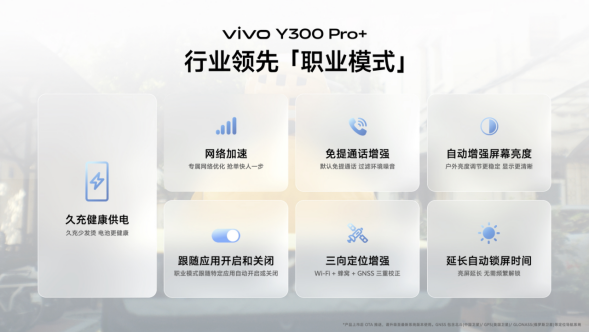 vivo Y300 Pro+搭载OriginOS 5系统,原子岛、小V圈搜、小V写作等多种好用功能。全新升级的职业模式加入了司机职业,支持久充健康供电,手机运行更流畅;升级的网络加速功能,可有效降低延迟并提高抢单成功率;更有三向定位增强功能,提供高精度导航定位,全面优化使用体验,提升工作效率。