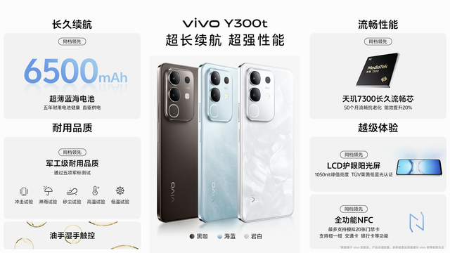 同时发布的还有全新vivo Y300t,其搭载6500mAh耐用蓝海电池、支持久充健康供电功能,提供行业领先的续航体验;配备天玑7300处理器;通过多项军标测试,更拥有磐石抗摔结构、IP64防尘防水,整机耐用可靠;1050nit超高亮度LCD阳光屏,日光下高亮清晰,暗光无频闪更护眼;配齐全功能NFC与红外遥控,同时还提供职业模式功能。