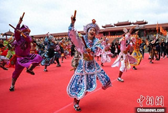 3月29日,正值农历三月初一,“天下妈祖回娘家”启动仪式在福建省莆田市湄洲妈祖祖庙天后广场举行。图为活动现场,英歌舞表演助兴。中新社记者 吕明 摄