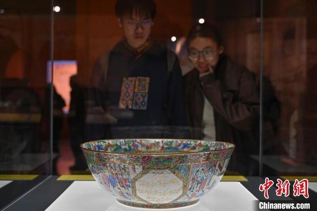 4月1日,广东广州,广东省博物馆“群星点亮的夜空——波斯文化艺术瑰宝展”中的广彩波斯文铭文人物故事图大碗吸引观众。中新社记者 陈骥旻 摄