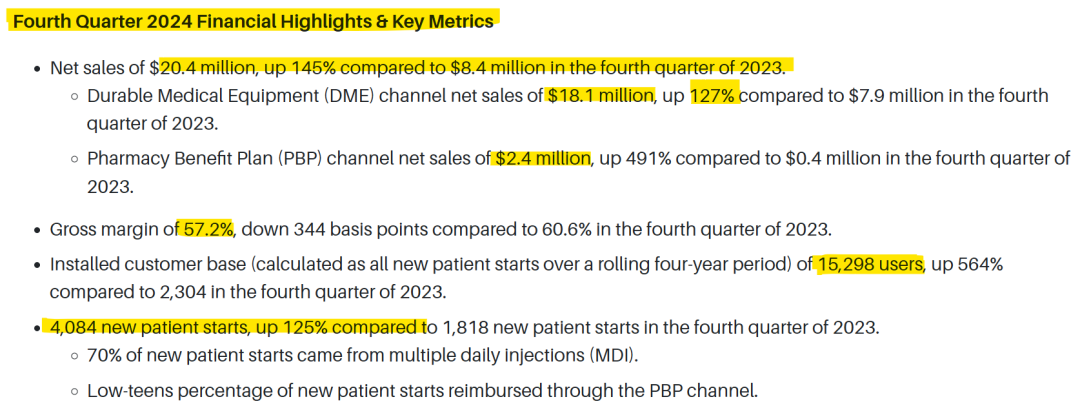 安装客户基数(按滚动四年期间新增患者计算)达15,298名用户,较2023年第四季度的2,304名增长564%;新增患者4,084例,较2023年第四季度的1,818例增长125%。