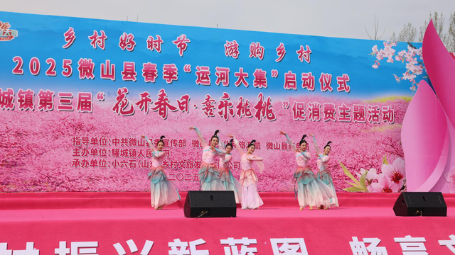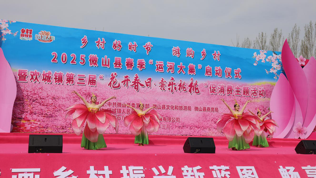非遗国潮交相辉映,文化盛宴惊艳开场。启动仪式在昂扬的舞狮表演中火热开场,驩城镇党委书记李福厚在致辞中表示本次活动通过“文化+生态+消费”的创新融合,让桃花“开”出产业、“结”出效益,打造全域旅游新体验,让传统文化在春日桃林中焕发新生机。县委常委、宣传部部长张国成强调活动将“以花为媒、以节促产”,助力乡村振兴绿色发展示范带建设。随着领导嘉宾共同启动运河大集,现场瞬间化作欢乐海洋——山东卫视《我是大明星》获奖歌手、舞者轮番登台,与游客零距离互动,将春日狂欢推向高潮。