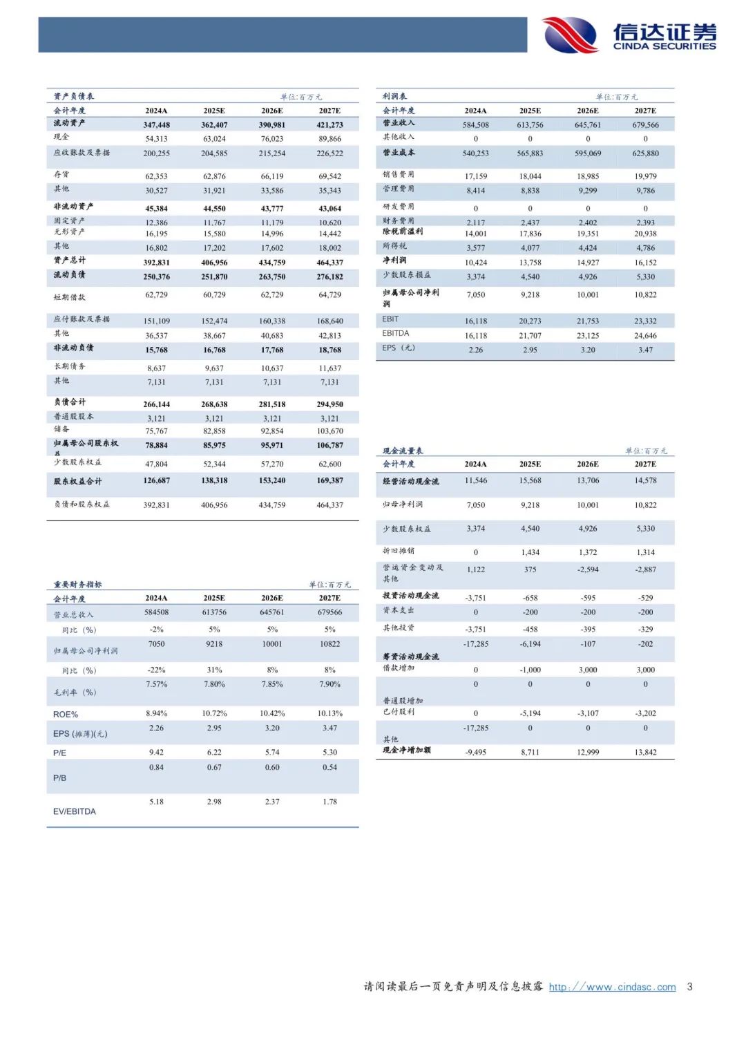 盈利预测:我们预计公司2025-2027年营业收入分别约为6137.56亿元、6457.61亿元、6795.66亿元,同比增速分别约为5%、5%、5%,实现归母净利润分别为92.18亿元、100.01亿元、108.22亿元,同比分别约增长31%、8%、8%,对应当前股价PE分别约为6倍、6倍、5倍。
