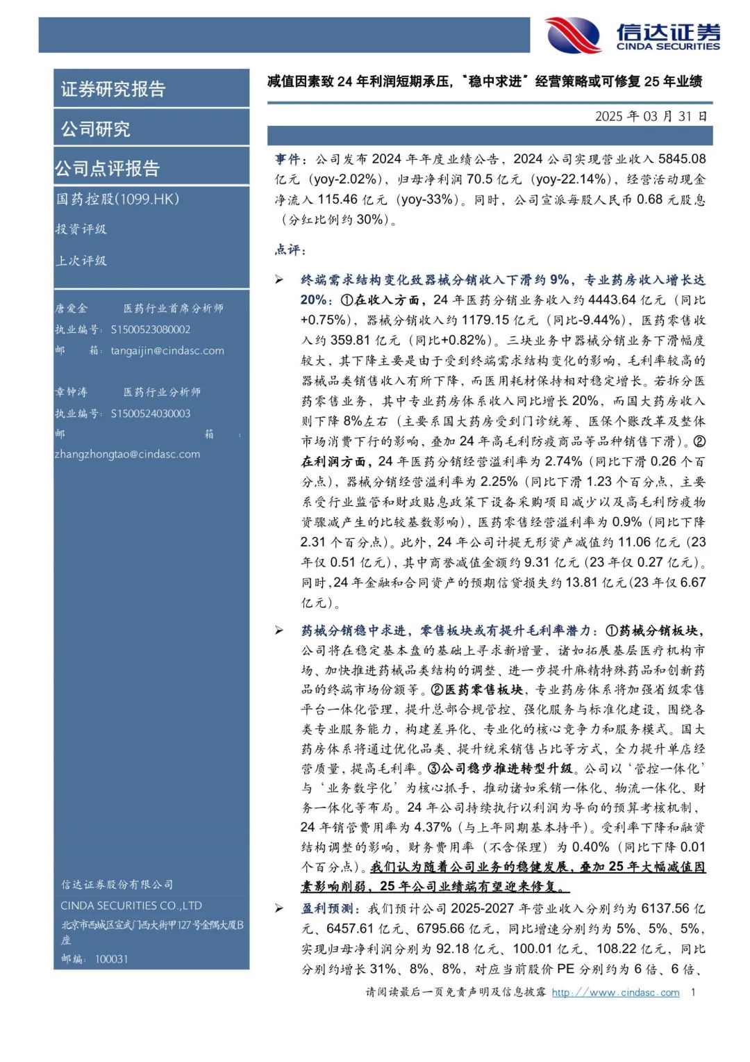 本文来自信达证券研发中心2025年3月31日发布的《国药控股(1099.HK)点评报告:减值因素致24年利润短期承压,“稳中求进”经营策略或可修复25年业绩》,欲了解具体内容,请阅读报告原文,唐爱金S1500523080002、章钟涛S1500524030003。
