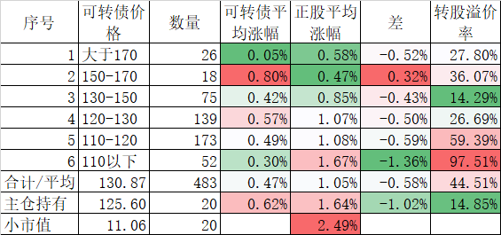 483只可转债平均上涨0.47%,对应正股平均上涨1.05%;我的主仓20只可转债平均上涨0.62%,对应正股平均上涨1.64%。账户合计实际也是上涨0.62%。今天没有任何操作。