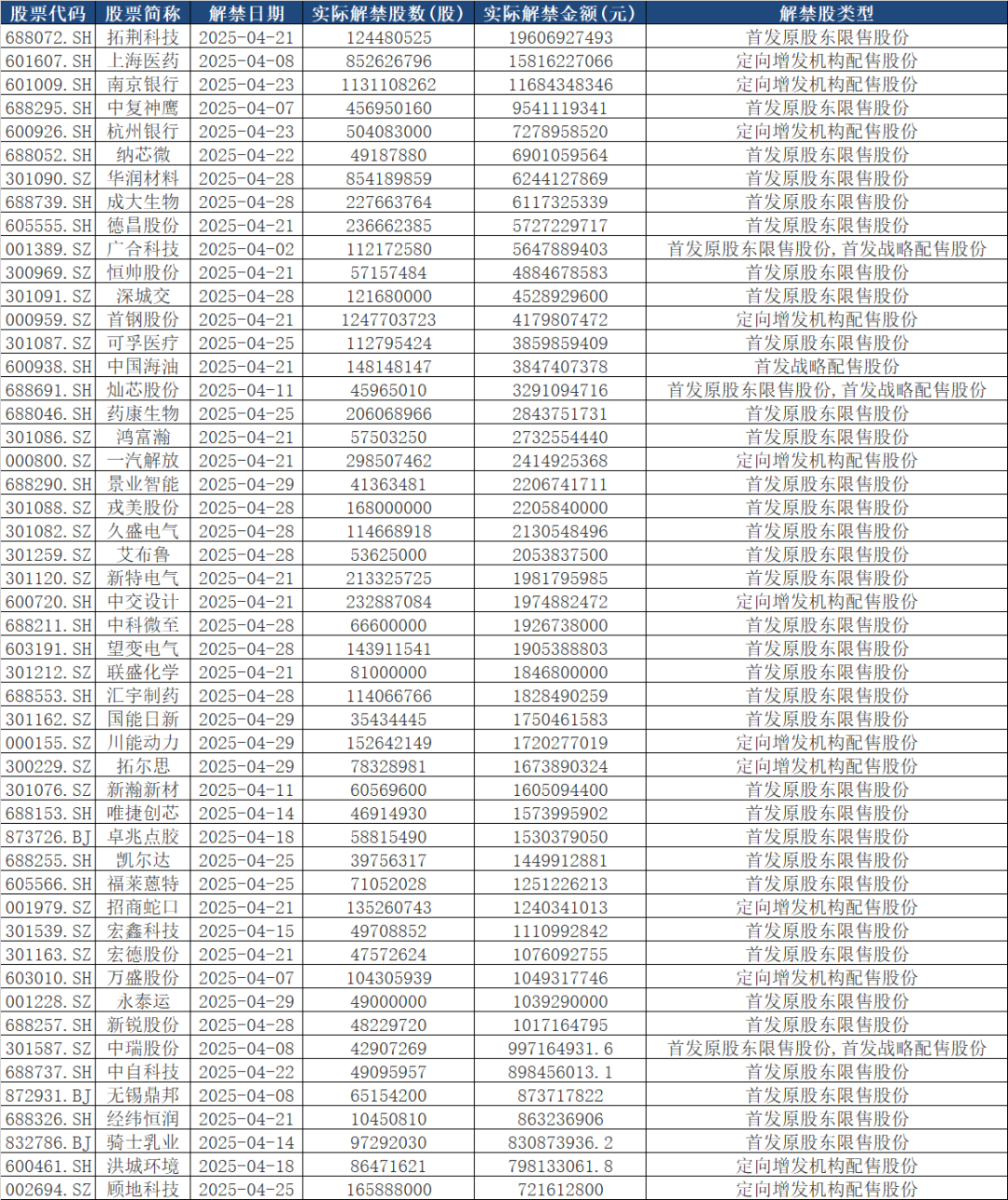 以下为2025年4月将解禁个股市值TOP50的数据,供大家投资参考。
