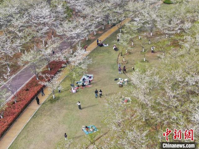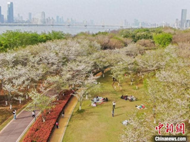 4月1日,江西南昌西湖区,民众在赣江之滨的朝阳江滩公园樱花树下散步。当日南昌春光明媚,南昌朝阳江滩公园樱花绽放青草丰满,不少民众来此踏春赏花和露营,享美好时光。(无人机照片)中新社记者 刘力鑫 摄