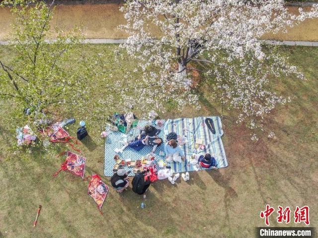 4月1日,江西南昌西湖区,不少民众在赣江之滨的朝阳江滩公园踏春和露营。当日南昌春光明媚,南昌朝阳江滩公园樱花绽放青草丰满,不少民众来此踏春赏花和露营,享美好时光。中新社记者 刘力鑫 摄