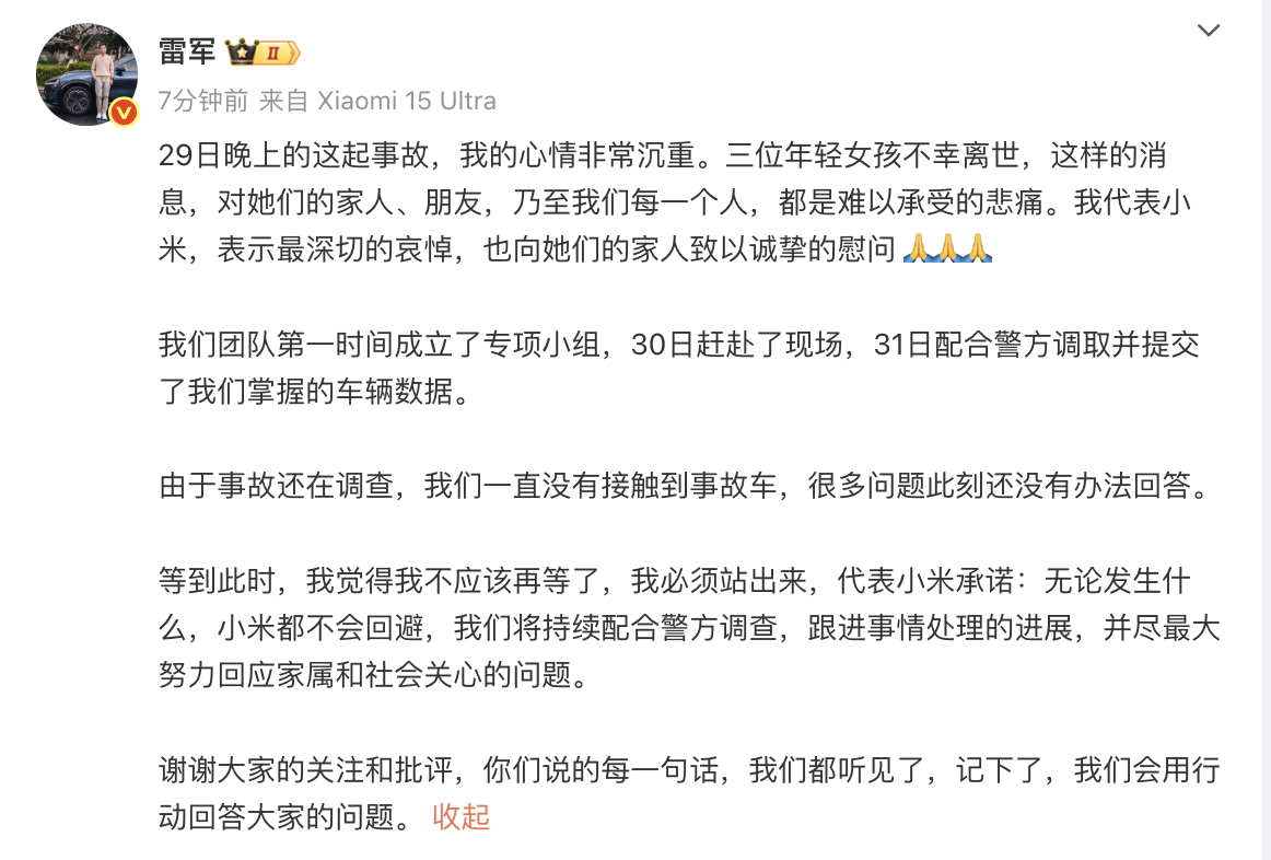 29日晚上的这起事故,我的心情非常沉重。三位年轻女孩不幸离世,这样的消息,对她们的家人、朋友,乃至我们每一个人,都是难以承受的悲痛。我代表小米,表示最深切的哀悼,也向她们的家人致以诚挚的慰问 ???
