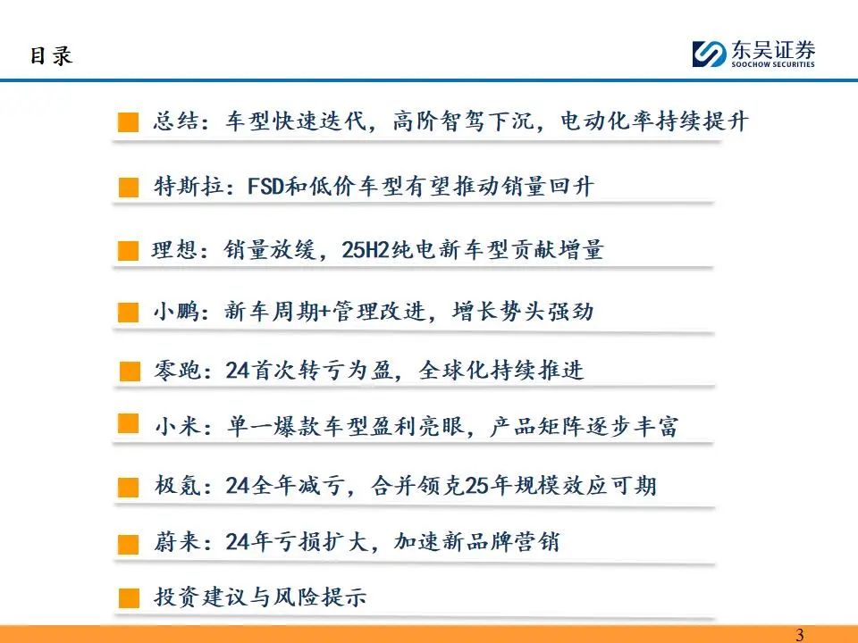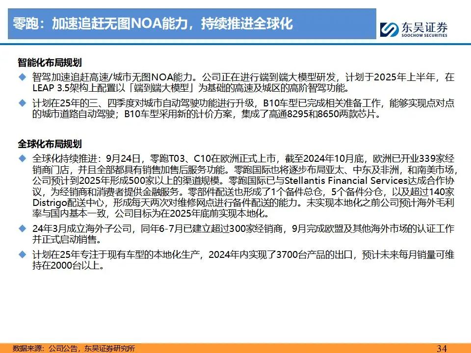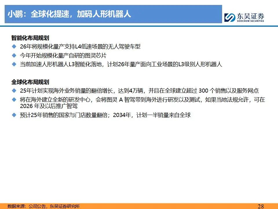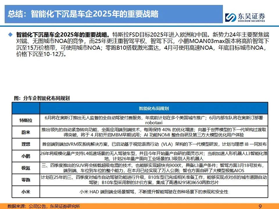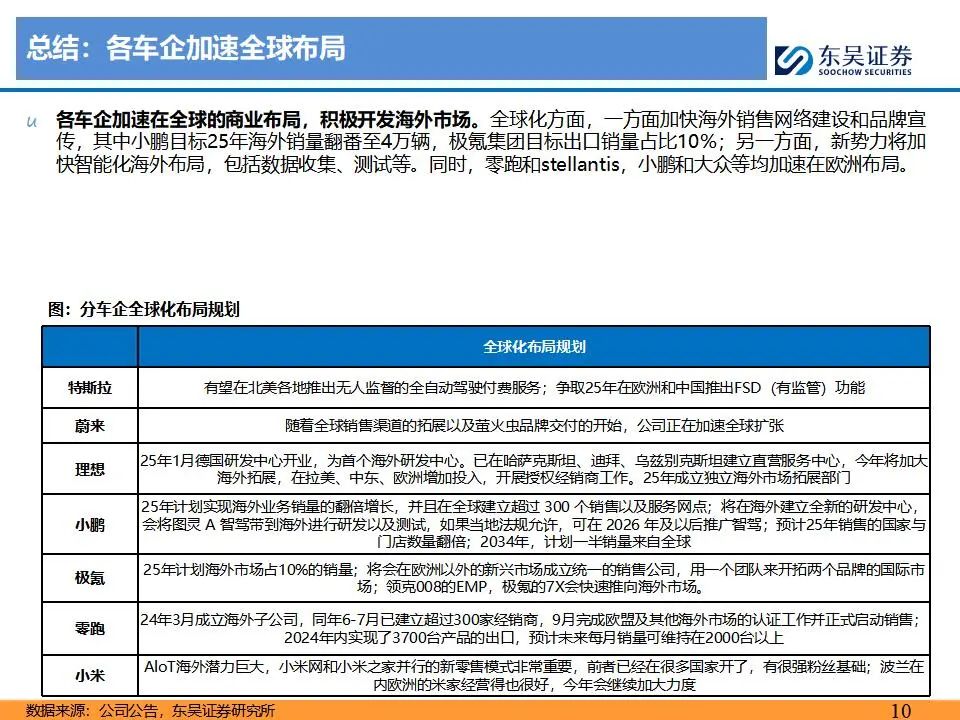 智能化和全球化是车企2025年两大战略。智驾方面,特斯拉FSD目标2025年进入欧洲和中国。新势力24年主要聚焦端对端、无图城市NOA的竞争,而25年更注重智驾平权、智驾下沉,小鹏MOAN03max版本将高阶智驾下沉至15万价格带,可使用城市NOA;零跑B10搭载激光雷达,4月可使用高速NOA,年底目标为使用城市NOA,价格下沉至10-12万。全球化方面,一方面加快海外销售网络建设和品牌宣传,其中小鹏目标25年海外销量翻番至4万辆,极氪集团目标出口销量占比10%;另一方面,新势力将加快智能化海外布局,包括数据收集、测试等。